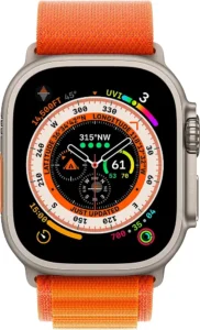 Apple Watch Ultra (GPS + Cellular) 49mm Titanium Case with Orange Alpine Loop, 1m Magnetic Charging Cable, Manufacturer’s Warranty – Parts and labor with 90 Days.