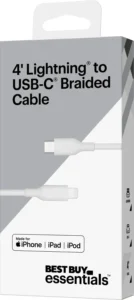 The Best Buy essentials 4’ Lightning to USB-C Braided Charge-and-Sync Cable will not only charge your Lightning-enabled iPhone, iPad or iPod, but also let you transfer files and sync your device. Its 4 ft. length gives you flexible placement options and its gray-and-white braided jacket keeps the cable protected.